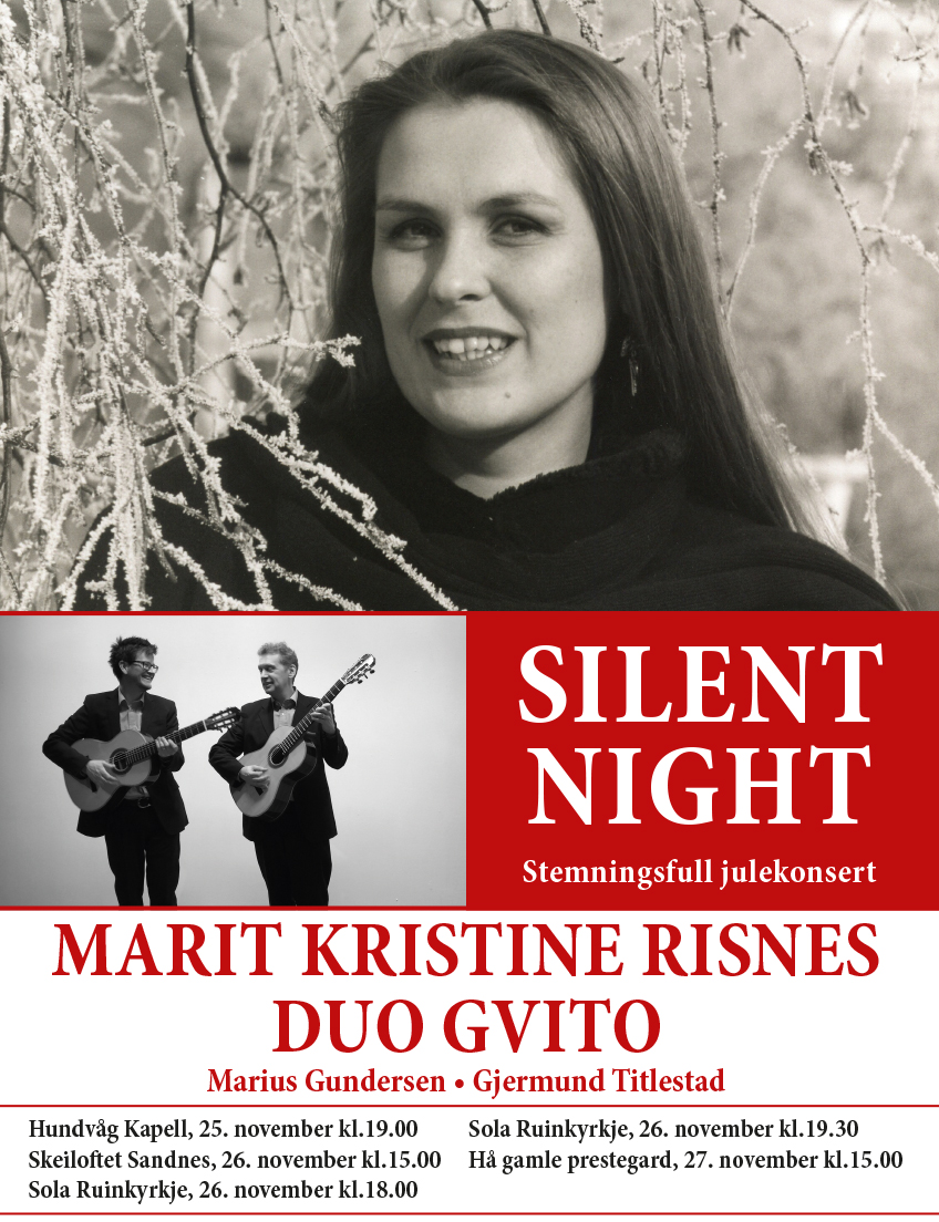 Med Stille Natt og dens opprinnelse på stille strenger som ramme rundt Julekonserten Silent Night, presenterer sopran Marit Kristine Risnes og Duo Gvito et stemningsfullt repertoar for sang og gitar for å feire den Hellige Natt, da jorden tok himmelen i favn.